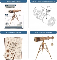 Objavte kúzlo konštrukcie s 3D dreveným modelom monokulárneho ďalekohľadu ROBOTIME Rokr. Tento krásne zdobený ďalekohľad ponúka trojnásobné zväčšenie a skutočnú dohľadovú vzdialenosť až 150 metrov, čo z neho robí ideálny dekoratívny aj funkčný prvok.