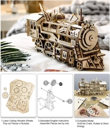 Zažite vzrušenie z montáže s týmto jedinečným 3D modelom drevenej lokomotívy. S pružinovým pohonom sa vlak skutočne pohybuje, zatiaľ čo parná píšťalka dodáva autentickosť. Model je navrhnutý pre jednoduchú montáž bez lepidla, s precízne vyrezanými dielikmi z preglejky.