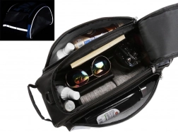 Reflexné prúžky pre väčšiu bezpečnosť a prídavný popruh pre nosenie cez rameno.