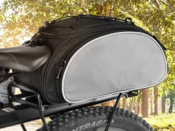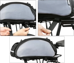 Gumové zarážky na klopni umožňujú bezpečné uloženie bundy či fľaše, zatiaľ čo reflexné prúžky zvyšujú vašu bezpečnosť na cestách. Univerzálny dizajn pasuje na väčšinu nosičov bicyklov a vďaka nastaviteľným prackám je montáž rýchla a jednoduchá.