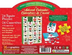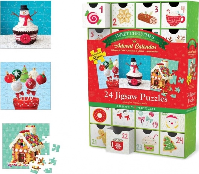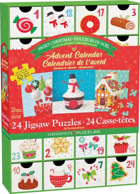 Adventný kalendár EUROGRAPHICS „Sladké Vianoce“ premení december na hravú tradíciu. Každá z 24 zásuviek ukrýva štvorcové puzzle s 50 dielikmi s lahodnými motívmi cukroviniek. Obrázky majú rozmer 12,5 × 12,5 cm a predloha je vytlačená na zadnej strane každej zásuvky pre jednoduché skladanie.