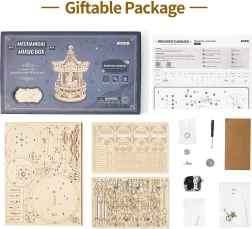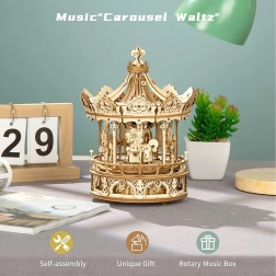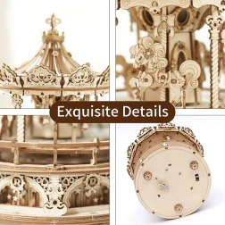 Keď ho zložíte, kolotoč ozdobí vašu poličku a jeho detailné spracovanie vás nadchne. Pre príjemné chvíle pri jeho skladaní poslúži romantická melódia, ktorú si môžete prehrať vďaka kvalitnému 18 tónovému strojčeku vyrobenému z japonských komponentov.