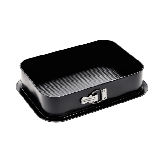 Praktická obdĺžniková tortová forma s odnímateľným okrajom a nepriľnavým povrchom pre jednoduché vybratie korpusov aj nepečených dezertov. Čierne prevedenie, pevná oceľ a spoľahlivý uzamykací mechanizmus pre pohodlné pečenie v plynových aj elektrických rúrach.