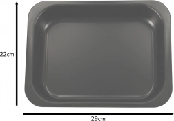 Vďaka praktickým rozmerom 29 × 22 × 6 cm (vonkajší rozmer cca 32 × 24 × 6 cm) sa plech hodí do väčšiny domácich rúr. Pevný materiál s hrúbkou 0,35 mm je ľahký, no odolný a ideálny na pravidelné pečenie.