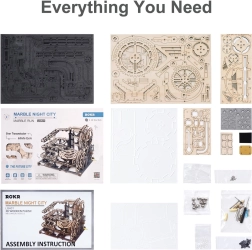 ROKR Mramorové Nočné Mesto je ohromujúci 3D skladací model guľôčkovej dráhy, ktorý kombinuje zábavu a vzdelávanie. Tento model sa skladá z 294 precízne vyrezaných dielov, ktoré tvoria zložitú dráhu s rôznymi prekážkami a mechanikou poháňanou ručne otáčaním kľúčkou. Súčasťou balenia je kompletný manuál, ktorý vás prevedie procesom skladania.
