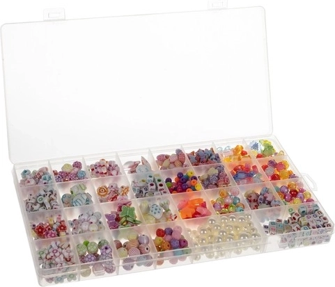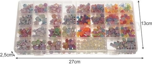 - Sada XXL v organizéri - 900 farebných komponentov umožňuje vytvoriť rôzne druhy šperkov. Súčasťou sady sú tiež obruče, šnúrka, zámky a spoje.