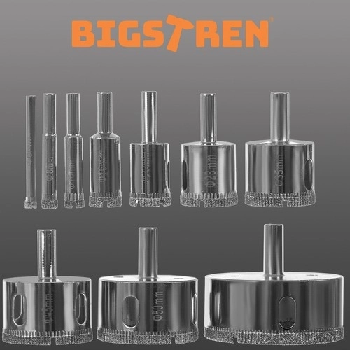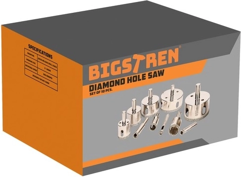 Sada 10 diamantových otvorových koruniek BIGSTREN pokrýva najčastejšie inštalatérske aj elektroinštalačné priemery: 6, 8, 10, 16, 20, 28, 35, 45, 50 a 68 mm. Vďaka diamantovému povlaku dosahujú korunky výbornú životnosť a maximálnu presnosť bez odštiepovania hrán dlaždíc. Vŕtať možno za mokra pre dlhšiu výdrž a rýchlejší odvod tepla, prípadne nasucho na kratšie úseky.