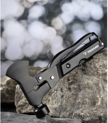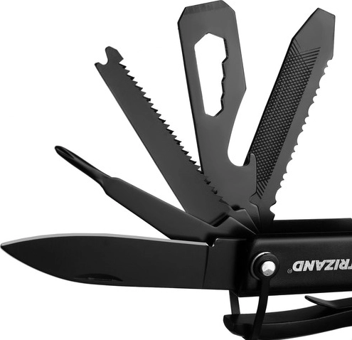 Tento robustný nástroj obsahuje nasledujúce funkcie: sekera, kombinované kliešte, pilník, škrabka na ryby, plochý skrutkovač, šesťhranný kľúč, harpúna, otvárač na fľaše, píla na drevo, krížový skrutkovač, nôž, kladivo, štikacie kliešte na drôty, kliešte, tlmič a zámok.