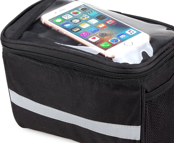 - Vrch obsahuje priehľadnú kapsu na mobil alebo malý tablet, ktorú môžete pohodlne používať počas jazdy.