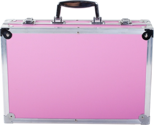 Kufrík v ružovej farbe s kovovými rohmi poskytuje robustnú ochranu a jednoduchú prenosnosť vďaka držadlu.