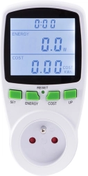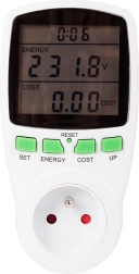 Veľký podsvietený LCD a štyri tlačidlá (SET, ENERGY, COST, UP) uľahčujú nastavenie aj čítanie kľúčových hodnôt, ako je napätie, prúd, príkon, frekvencia a doba merania.