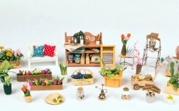 Miniatúrne kvety, nábytok, vankúše a doplnky vytvárajú vernú atmosféru záhradnej terasy – ideálne ako štýlová domáca dekorácia.