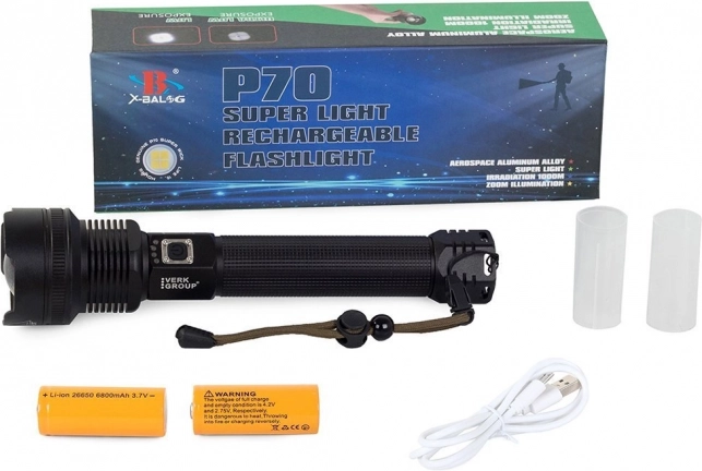 - svietidlo P516-P70, 2× batérie 26650, USB kábel, originálne balenie