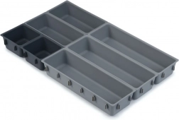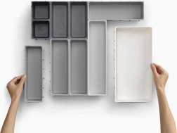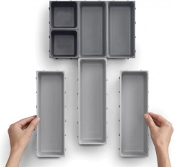 Sada obsahuje 10 kontajnerov rôznych veľkostí, ktoré jednoducho spojíte pomocou integrovaných háčikov. Vďaka kompaktným rozmerom skvele sadne do väčšiny štandardných zásuviek a vytvorí prehľadný systém pre príbory, nože, metličky, škrabky aj kancelárske či kreatívne drobnosti.