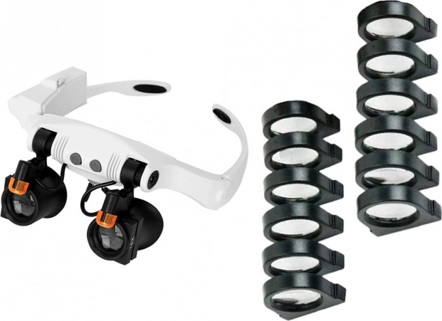 Sada obsahuje 14 vymeniteľných šošoviek: 2x 15X, 2x 10X, 2x 7X, 2x 6X, 2x 5X, 2x 4X, 2x 3X, ktoré umožňujú 21 kombinácií zväčšenia.