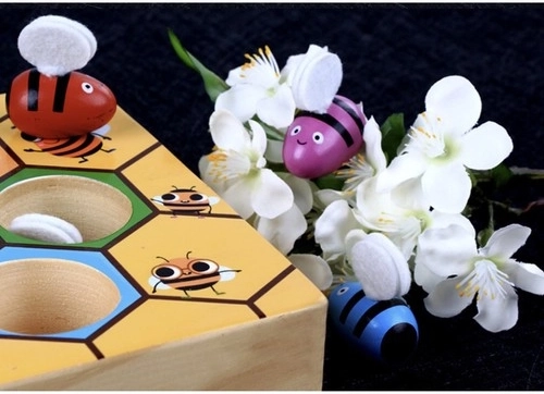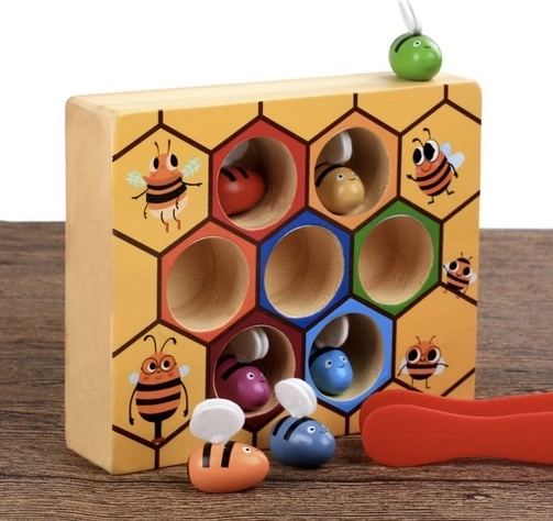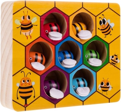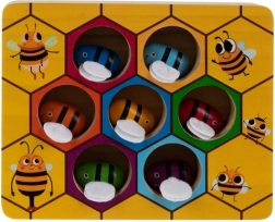 Každá včielka má svoju farbu a miesto v pláste. Deti si pri hre prirodzene precvičujú rozpoznávanie farieb, logiku aj priestorové vnímanie.