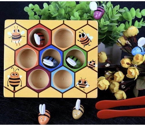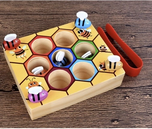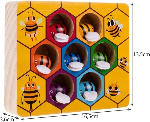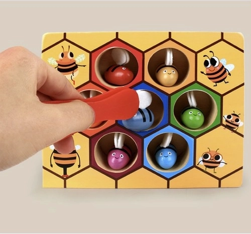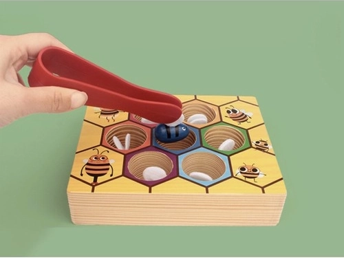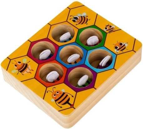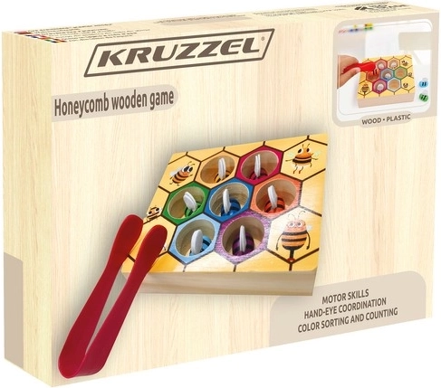Drevená hra plást medu KRUZZEL spája zábavu s učením. Pomocou pinzety deti opatrne chytajú farebné včielky a vkladajú ich do zodpovedajúcich šesťuholníkových otvorov. Táto roztomilá motorická vkladačka rozvíja jemnú motoriku prstov, súhru oko–ruka a trpezlivosť, zatiaľ čo výrazné farby podporujú vizuálne vnímanie a triedenie.
