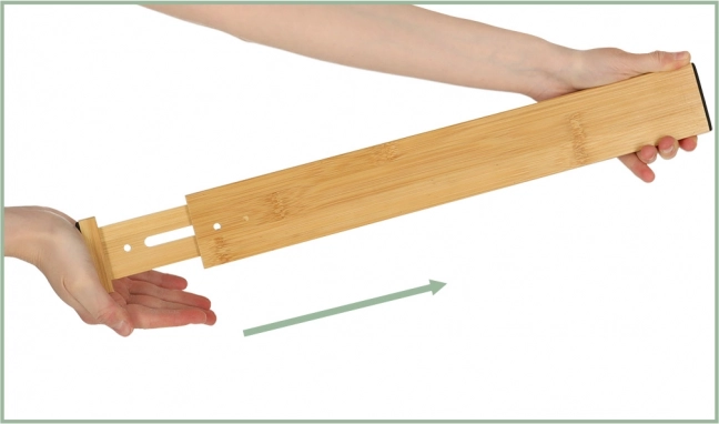 Bambusová deliaca priečka nielenže udrží vaše zásuvky usporiadané, ale taktiež im dodá estetický vzhľad. Priečka je vybavená ochrannými vankúšikmi na okrajoch, ktoré chránia zásuvku pred poškriabaním a zabraňujú pohybu organizéra pri vysúvaní. Použitie je veľmi jednoduché – stačí vybrať zásuvku, stlačiť priečku na najmenšiu veľkosť a umiestniť ju do požadovaného miesta. Produkt sa prispôsobí tvaru vašej zásuvky automaticky.