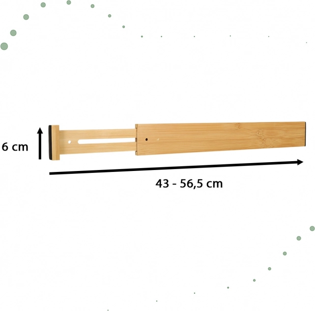 Predstavujeme vám užitočného pomocníka pre každodennú organizáciu priestoru vo vašej domácnosti. Tento bambusový organizér umožňuje jednoduché rozdelenie produktov v jednej zásuvke, a to vďaka svojej nastaviteľnej dĺžke od 43 do 56,5 centimetrov. Je univerzálny a možno ho používať v kuchyni, kúpeľni alebo skrini, a to aj vo väčších zásuvkách.