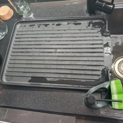 Špeciálne tvarovaná miska s rebrovaním a bočným odvodom vedie vodu priamo do drezu. Pracovná doska tak zostáva suchá a čistá.
