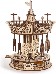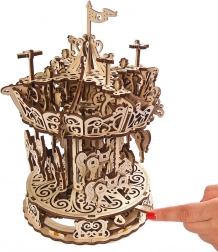 Urobte si radosť elegantným kolotočom z kvalitnej preglejky, ktorý spája nostalgiu s chytrou mechanikou. Vďaka gumovému natahovaciemu pohonu sa stredový stĺp a strieška točia opačným smerom, čím vytvárajú optickú ilúziu vysokej rýchlosti. Koníky plynule stúpajú a klesajú a nad kolotočom krúžia drobné vtáčiky – to všetko je krásne vidieť vďaka otvorenému dizajnu.