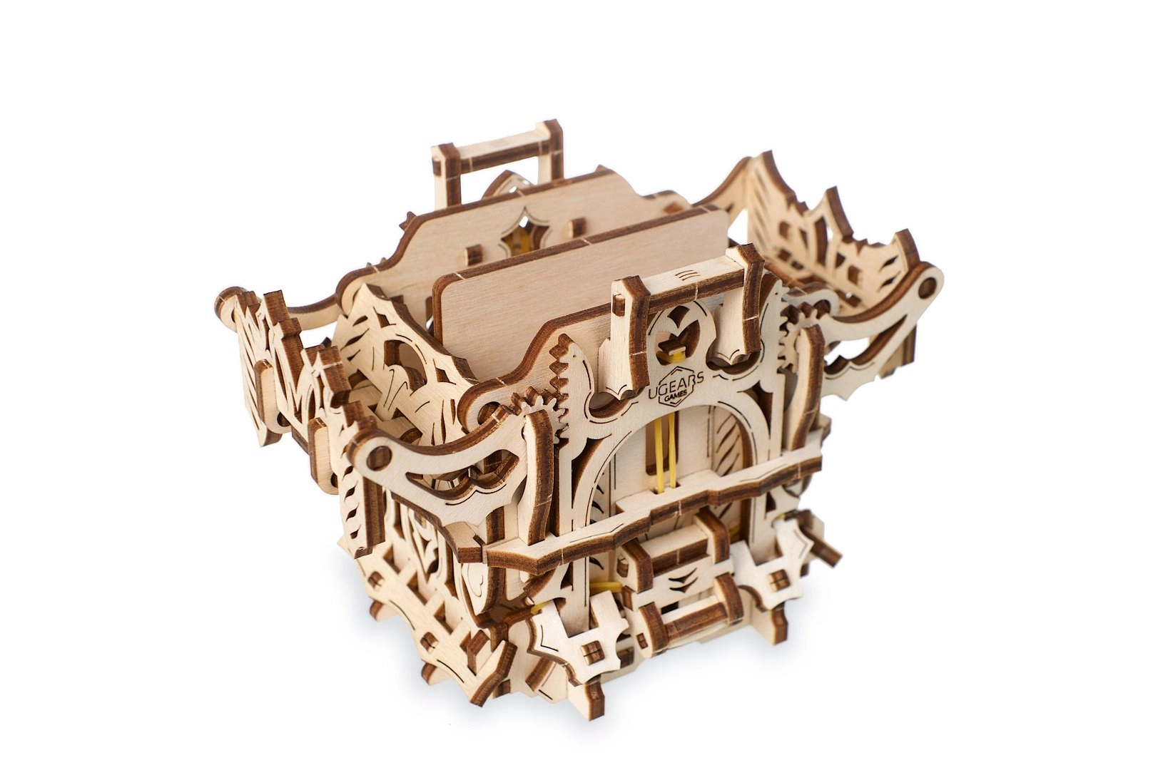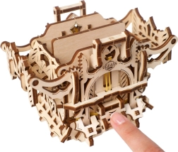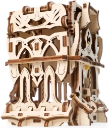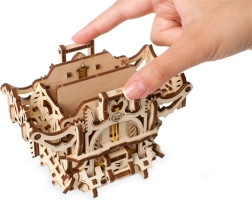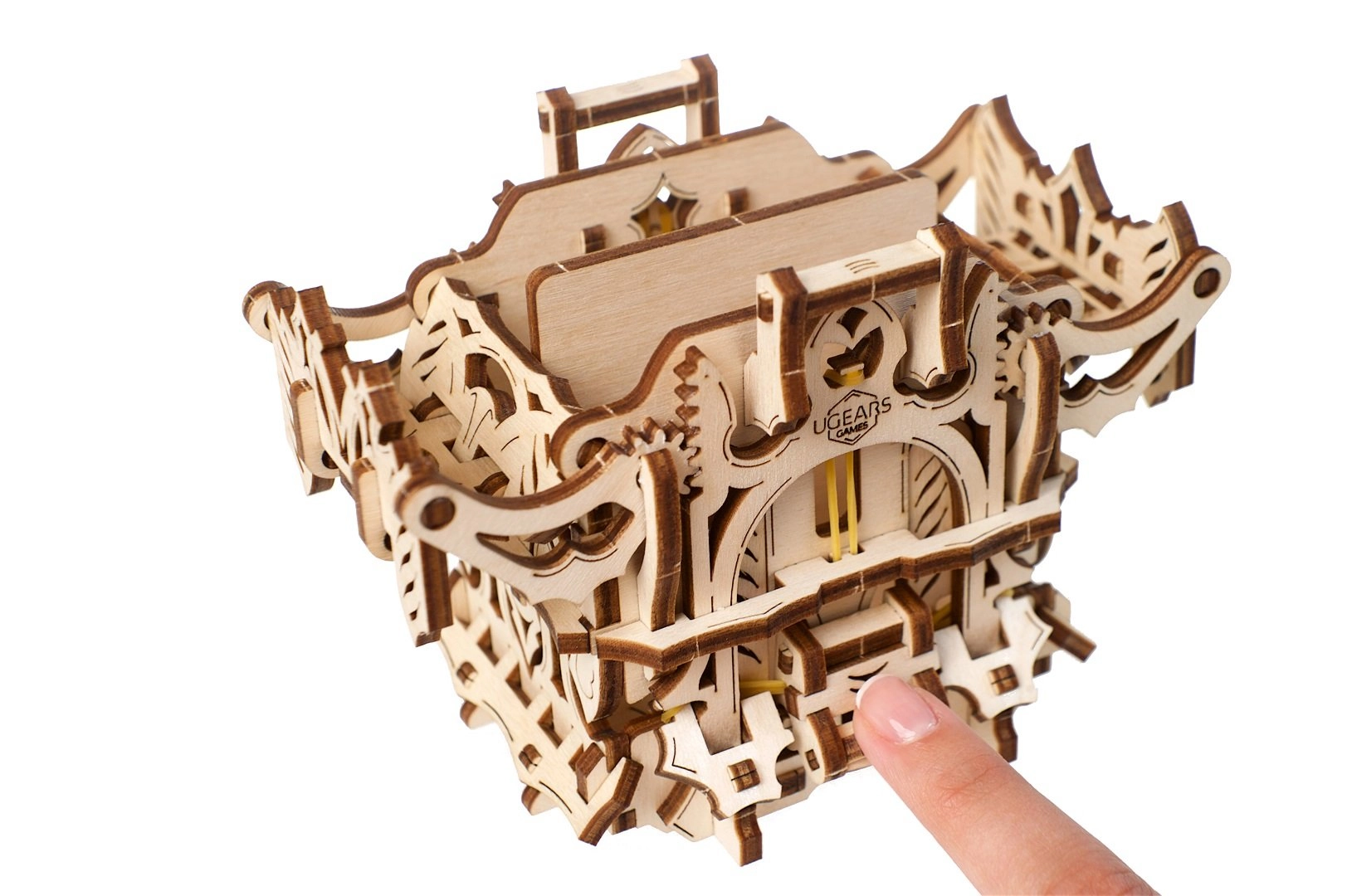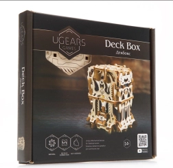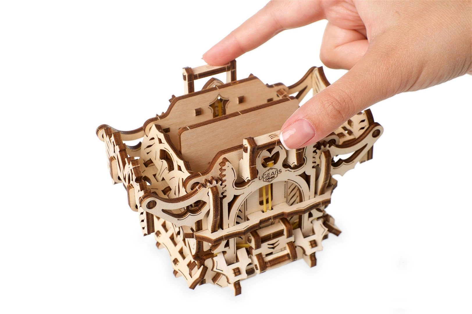 Elegantná drevená schránka na karty od UGEARS spája mechanický model a praktické úložisko pre vaše balíčky. Obsahuje dve priehradky pre až 120 kariet štandardnej veľkosti, otvára sa stlačením horných výstupkov a zatvára tlačidlom pri päte konštrukcie. Model z prírodnej preglejky vyniká fantasy dekoráciami, možno ho ľahko zostaviť bez lepidla a prípadne dofarbiť akvarelmi.