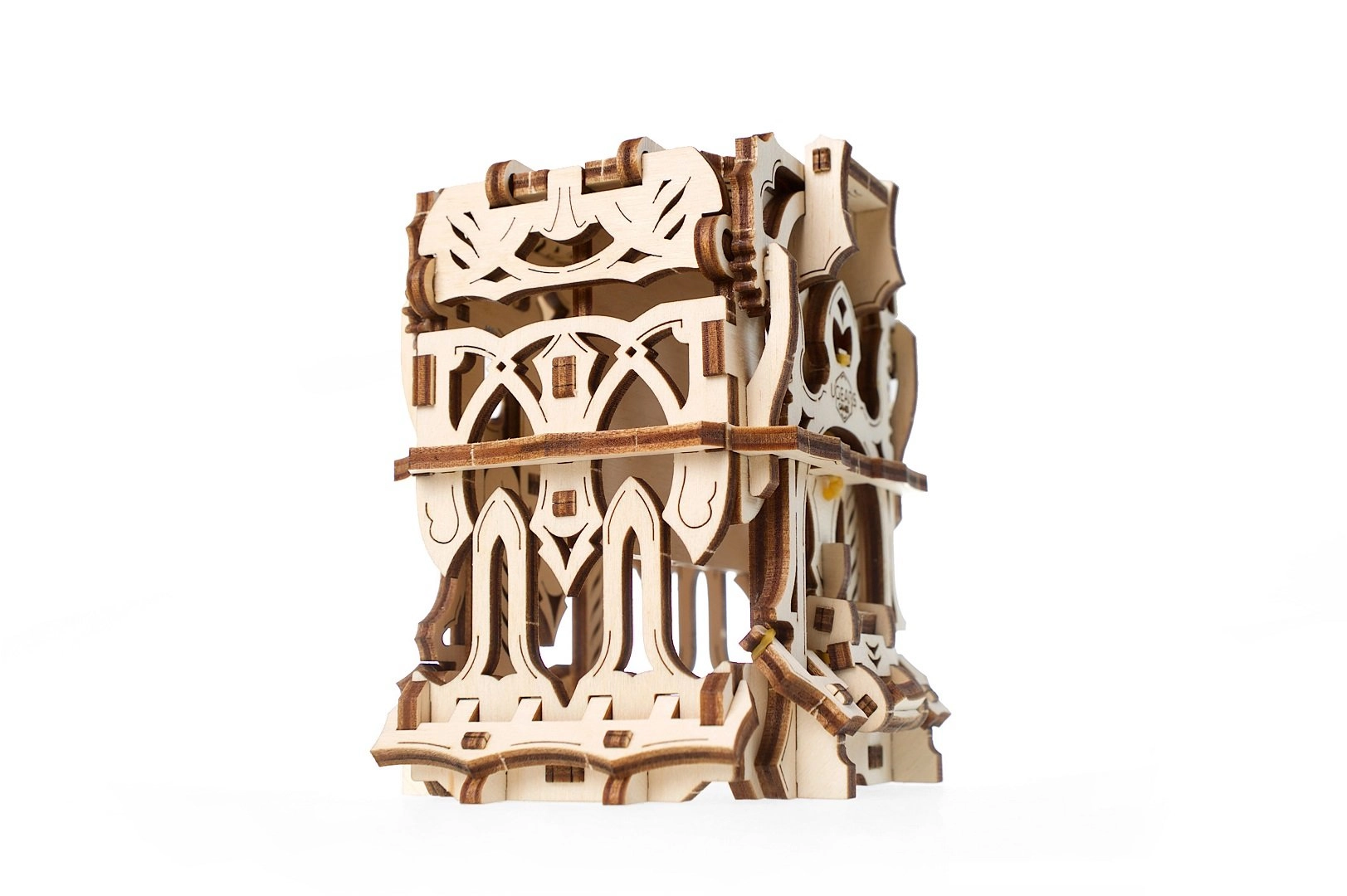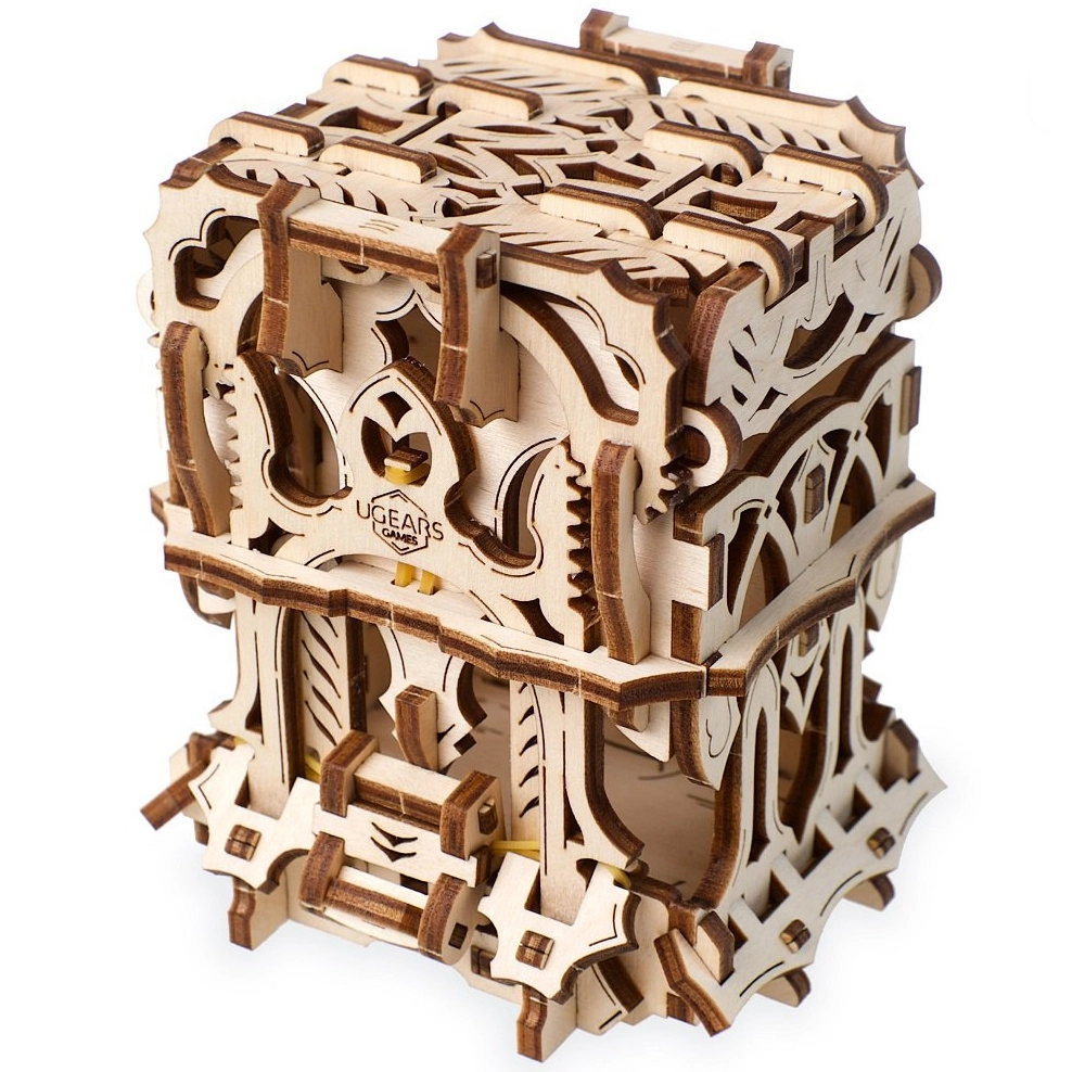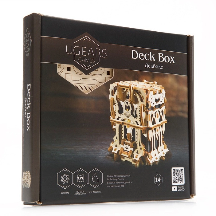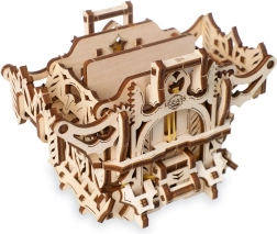 Elegantná drevená schránka na karty od UGEARS spája mechanický model a praktické úložisko pre vaše balíčky. Obsahuje dve priehradky pre až 120 kariet štandardnej veľkosti, otvára sa stlačením horných výstupkov a zatvára tlačidlom pri päte konštrukcie. Model z prírodnej preglejky vyniká fantasy dekoráciami, možno ho ľahko zostaviť bez lepidla a prípadne dofarbiť akvarelmi.