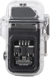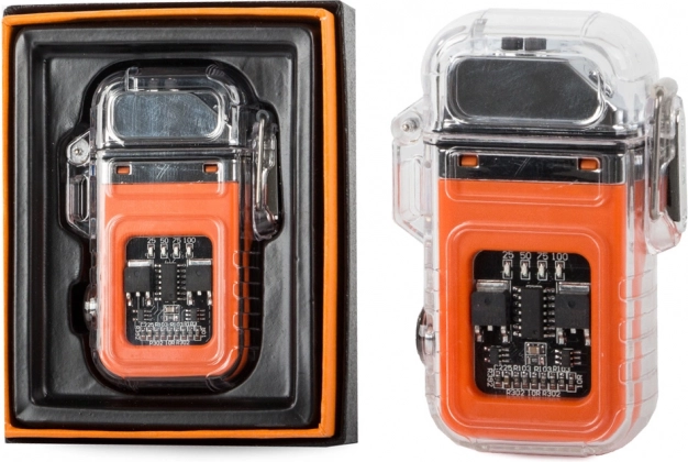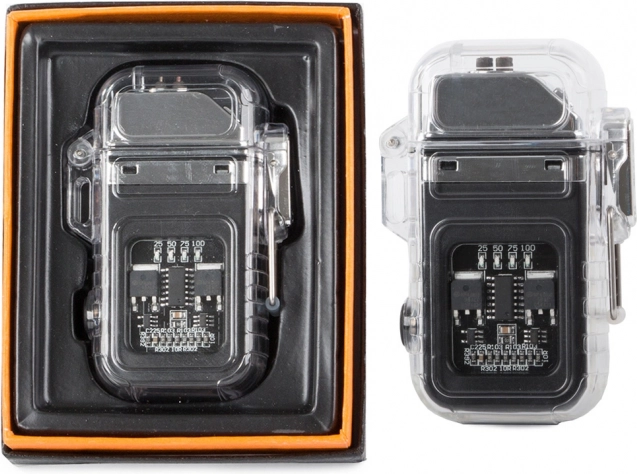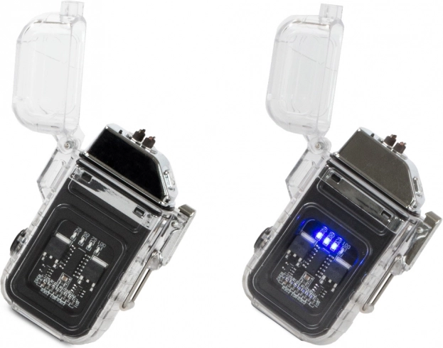 Robustné telo s tesnením, gumovým tlačidlom a uzáverom s klipom zvyšuje odolnosť voči vlhkosti a nárazom. Zapaľovač sa jednoducho nabíja cez micro USB (kábel je súčasťou) a štyri modré LED prehľadne ukazujú stav nabitia (100/75/50/25 %). V balení nechýba elegantná krabička, takže je skvelý aj ako darček.