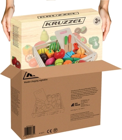 Súčasťou je debnička na prehľadné uloženie, 2 drevené nožíky, doska a imitácia škrabky. Sada rozvíja jemnú motoriku, koordináciu oko–ruka, kreativitu aj spoluprácu pri spoločnej hre. Skvelé do detskej kuchynky, škôlky aj na cesty.