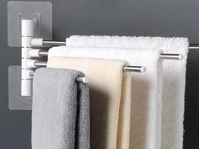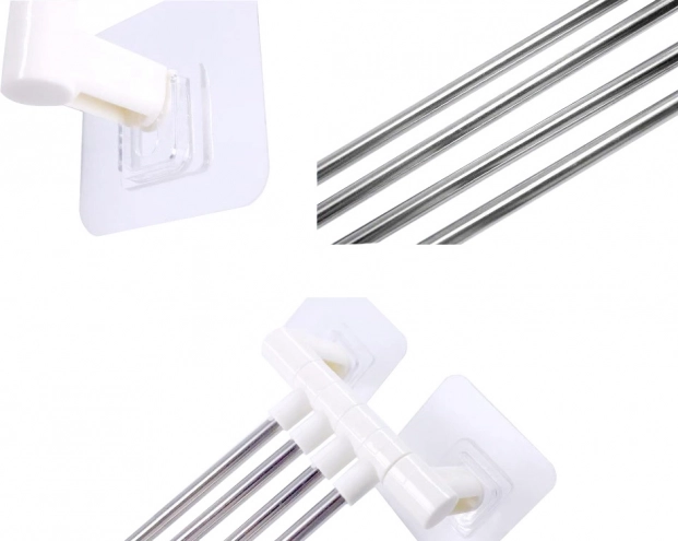 Montáž je rýchla a čistá – bez vŕtania. Silná samolepiaca plocha drží na hladkých povrchoch, takže nepoškodíte obklady. Ideálne do kúpeľne, kuchyne či práčovne, kde oceníte úsporu miesta aj jednoduchý prístup k uterákom.