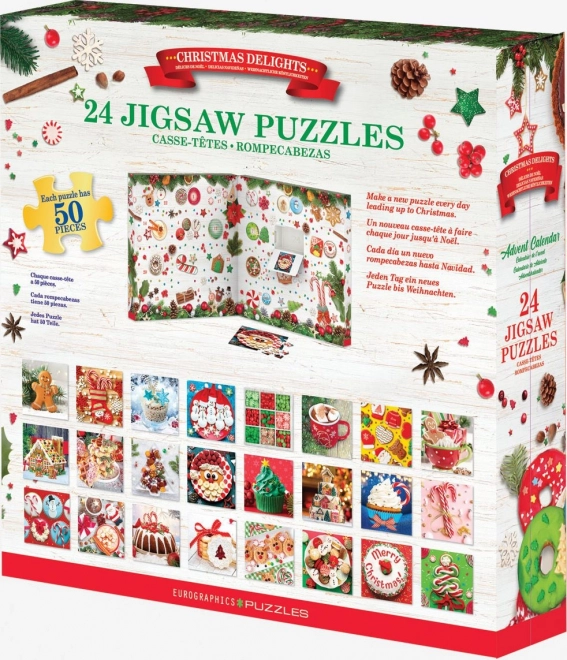 Tento adventný kalendár od EUROGRAPHICS prináša radosť do každého decembrového dňa. V 24 okienkach nájdete 24 rôznych puzzle, každé s 50 dielikmi a krásnym vianočným motívom. Obrázky sú štvorcové a po poskladaní majú rozmer cca 12,5 × 12,5 cm. V každom okienku je priložená aj predloha pre jednoduchšie skladanie a na zadnej strane obalu nájdete prehľad všetkých motívov.