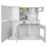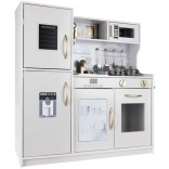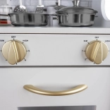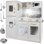 Táto drevená kuchynka XL je navrhnutá pre dlhé hodiny zábavy. Integrované LED podsvietenie umiestnite podľa ľubovôle pod skrinku, do skrinky alebo do rúry a otočné prepínače s cvakaním navodia dojem skutočného varenia. Robustná MDF konštrukcia a elegantné bielo‑zlaté prevedenie sa stanú ozdobou detskej izby.