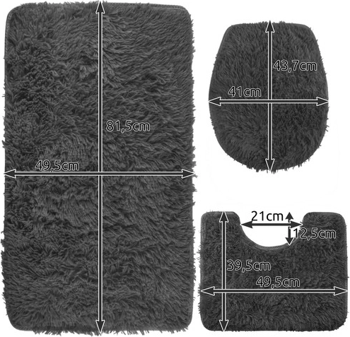 - 3-dielna sada: obdĺžnik do zóny vane/sprchy, kontúrový koberec k WC, poťah na veko toalety