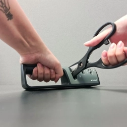 Samostatný slot pre nožnice a dva stupne pre nože: hrubé zarovnanie ostria a jemné doostrenie pre maximálnu presnosť rezu.