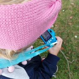 Súčasťou balenia je pamäťová karta 32GB, takže deti môžu hneď začať tvoriť. Nechýba selfie fotoaparát, množstvo zábavných rámikov a filtrov (čiernobiely, sepia, negatív), sériové snímanie a auto‑vypnutie na úsporu energie. Silikónová mačacia ochranná nadstavba a popruh zaistia bezpečné nosenie.