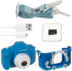 Zábavný detský fotoaparát KRUZZEL s 2" displejom, funkciou selfie a nahrávaním videa v Full HD. Súčasťou je 32GB karta, roztomilý silikónový kryt v tvare mačky, 5 hier na voľné chvíle a jednoduché ovládanie pre deti od 3 rokov.