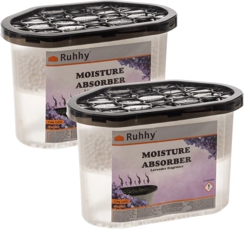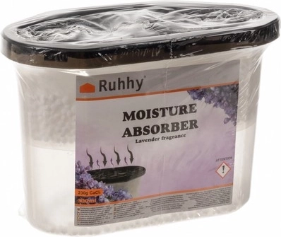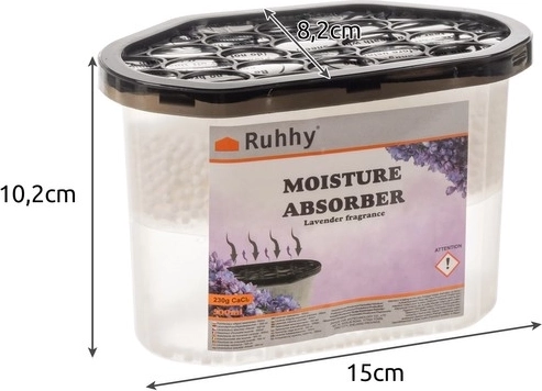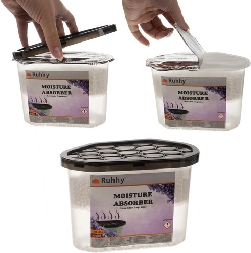 Pohlcovač vlhkosti s jemnou levanduľovou vôňou, ideálny pre použitie v domácnosti, garáži alebo sklade. Tento pohlcovač pomáha redukovať vlhkosť vzduchu a zabraňuje vzniku plesní, húb a korózie. Perfektný pre kúpeľne a kuchyne.