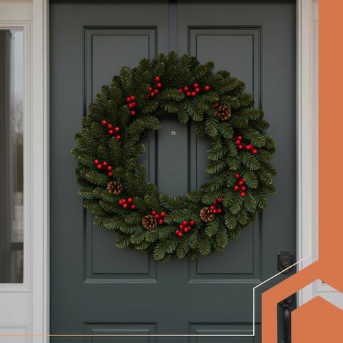 Elegantná kombinácia zeleného ihličia, červených bobúľ a prirodzene pôsobiacich šišiek vytvára výraznú sviatočnú dekoráciu na dvere, steny aj rímsy.