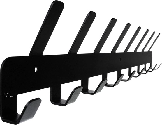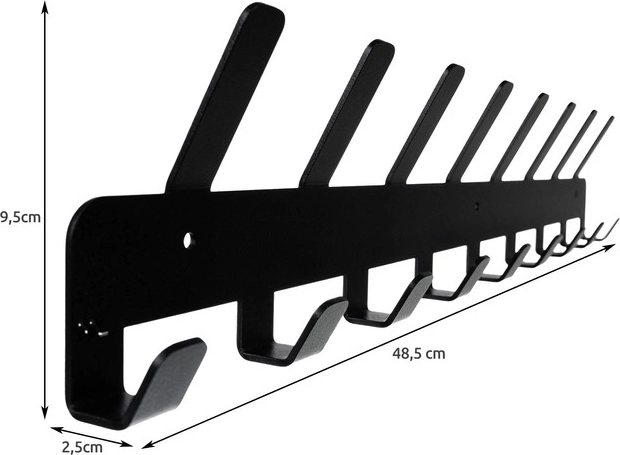 Vešiak je vyrobený z odolnej ocele a opatrený práškovou farbou, ktorá chráni proti korózii a poškrabaniu. Hodí sa do interiéru aj k zastrešeným vstupom. Inštalácia je jednoduchá – v balení sú priložené hmoždinky a skrutky, stačí vyvŕtať otvory vrtákom 5 mm a prišraubovať.