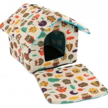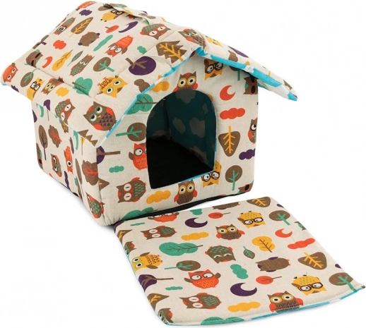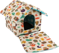Domček je ľahký a jednoducho prenosný, takže si ho vezmete aj na cesty a miláčik sa bude cítiť ako doma. Odolný poťah je príjemný na dotyk, nezachytáva chlpy a je odolný voči poškriabaniu. Dizajn so sovičkami oživí interiér a vytvorí útulné miesto na oddych.
