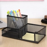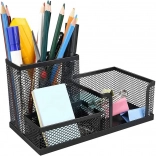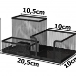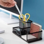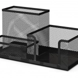Čierny sieťovaný stolový organizér poskytuje elegantné a funkčné riešenie pre usporiadanie kancelárskych potrieb. So svojimi tromi priestrannými priehradkami vám umožní mať všetko dôležité po ruke a zjednoduší vašu pracovnú plochu.