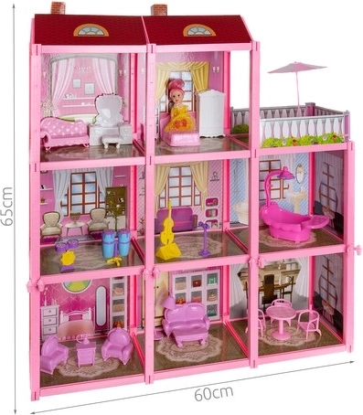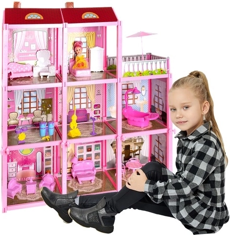 - Priestranný dizajn: Domček je určený pre veľkú rodinu bábik, obsahuje 3 poschodia, 8 miestností a balkón.