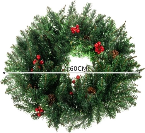 Štýlový dizajn - umelý vianočný veniec je skvelým doplnkom do akéhokoľvek priestoru. S jeho pomocou môžete vytvárať jedinečné kompozície nielen do obývacej izby, ale aj do predsiene alebo na vchodové dvere. Veniec je ozdobený umelými šiškami a vetvičkami s červenými bobuľami.
