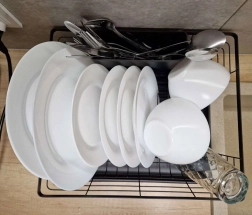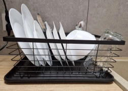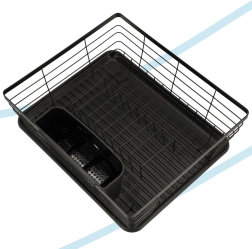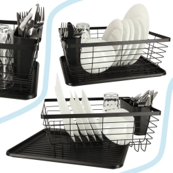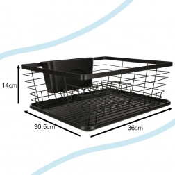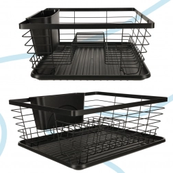 Štýlový čierny odkvapkávač na riad spája moderný dizajn a praktickosť. Ponúka veľkú kapacitu, samostatný zásobník na príbory a odkvapkávací tác, ktorý udrží kuchynskú linku suchú a čistú. Pevná kovová konštrukcia s plastovou táckou zabezpečuje dlhú životnosť a jednoduchú údržbu.