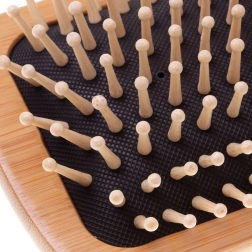 Zaoblené drevené kolíky na pružnej podložke hladko kĺžu vlasmi a masírujú pokožku hlavy bez podráždenia – ideálne pre citlivé detské vlásky.