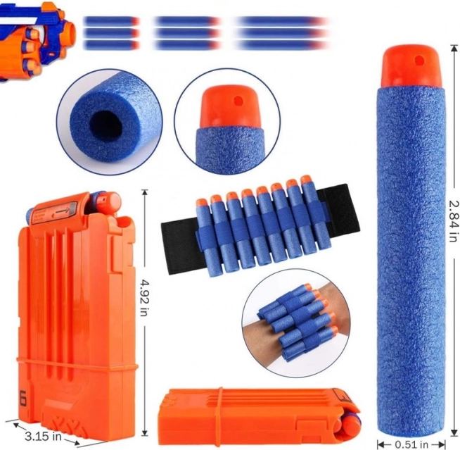 5. Obsah sady: Sada obsahuje taktickú ochrannú vestu, ochranné okuliare, 30 šípok, šatku s potlačou na tvár, nábojový pásik na nosenie na zápästí a ďalší zásobník nábojov.