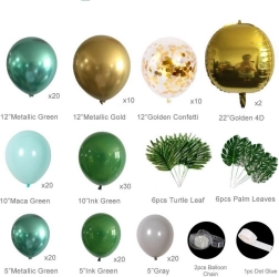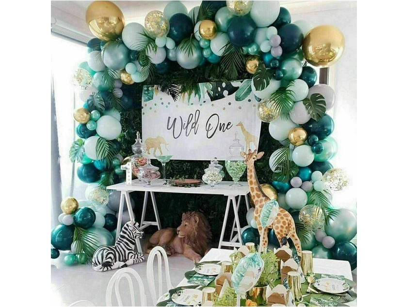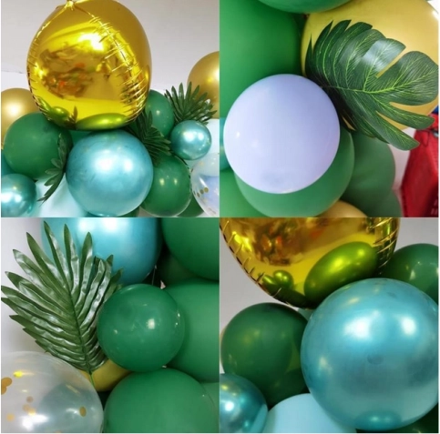 Montáž je jednoduchá: balóniky nafúknite vzduchom či héliom a upevnite do pásky s očkami. Menšie balóniky rozmiestnite po obvode pre plný a vrstvený efekt. Tropické a palmové listy dodajú výsledku exotický nádych a perfektne ladia so zeleno–zlatou paletou.