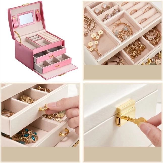 Medzi osobnými vecami každej ženy zohrávajú dôležitú úlohu šperky. Viacúrovňová šperkovnica je nepostrádateľný a spoľahlivý výrobok pri ukladaní vašich cenností. Oddelené priehradky a zásuvky poskytujú dokonalé úložisko pre náušnice, náramky, hodinky, retiazky, okuliare a ďalšie cennosti. Kazeta na šperky odstráni problém s retiazkami zamotanými do seba, odermi a poškriabaním. Mäkké polstrovanie chráni vaše vzácne šperky pred poškriabaním. Šperkovnica má veľké odnímateľné zrkadlo, ktoré je vhodné na skúšanie šperkov aj líčenie.