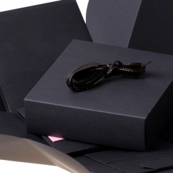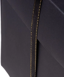 Krabička s čiernou stuhou a zlatým prešívaním, vhodná pre elegantnú darčekovú prezentáciu.