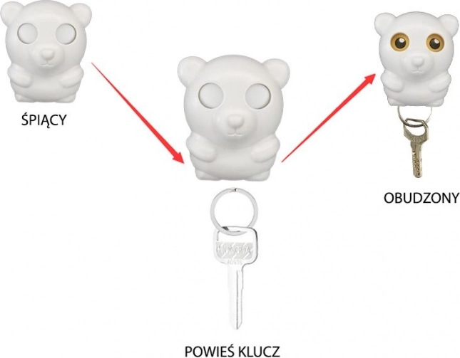 Vešiak na kľúče, ideálny do predsiene, kam si budete môcť zavesiť kľúče, keď prídete domov. Po zavesení kľúčov medvedík otvorí oči, aby na ne dohliadol. Vďaka montáži vešiaka priamo pri východe už nikdy nezabudnete kľúče, otvorené oči medvedíka vám ich určite pripomenú.